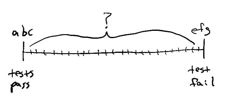 And follow up by telling it a commit that you know is bad. If you have the latest code currently checked out, you can omit a hash, otherwise provide a specific commit hash (such as efg from my beautiful drawing above).